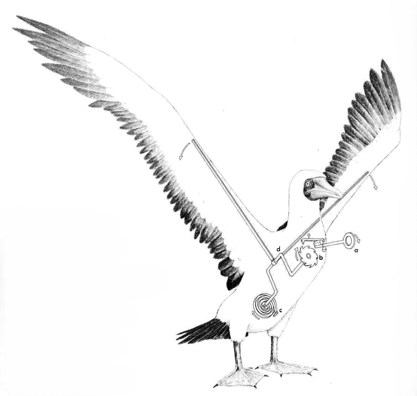 De hier afgebeelde gent wordt voorgesteld als een machine. Zijn wezen is gereduceerd tot een reeks gedetermineerde reacties op specifieke prikkels, en zijn lichaamsdelen zijn niets meer dan losse onderdelen die op mechanische wijze met elkaar in verbinding staan. Het is niet de gent zelf die met zijn vleugels klappert: het is het reactiemechanisme in het gentenlijf dat door een prikkel wordt geactiveerd. De gent zelf heeft hier welbeschouwd niets mee te maken, zoals ook blijkt uit zijn doodse blik.