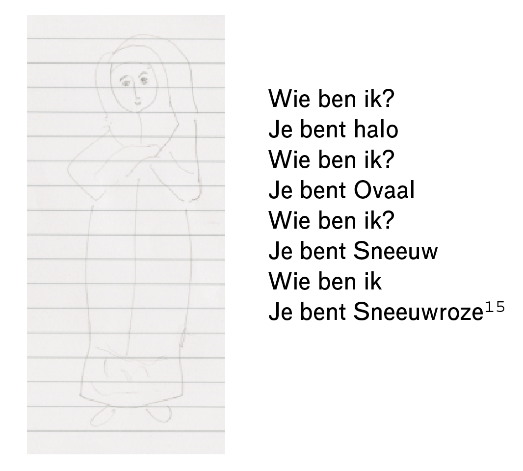 Ik bedenk hoe hello-hallo-halo-hol voorafgaan aan de geboorte van het bergselmeisje, waarmee ik wil zeggen dat ze werd geboren binnen de mij=spleekoogtaal, en als ik de logica van O-Neokolonie zou moeten volgen, dan zou het niet te vergezocht zijn te zeggen dat ik met een halo ben geboren. Mia ook. En omdat we zijn geboren in een land dat is bezet door zelfstandig naamwoorden, ‘zijn we feitelijk allemaal moederloos’.[14]