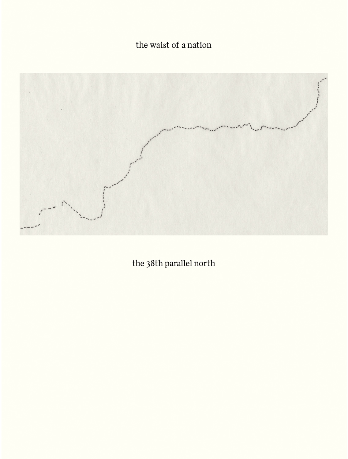 Vanuit de lucht gezien is dit een sterk vereenvoudigde weergave van de zogenaamde Koreaanse gedemilitariseerde zone (dmz): ‘Een scheidslijn die na de Tweede Wereldoorlog werd gecreëerd aan het einde van de vijfendertig jaar lange Japanse bezetting van Korea. De vs bezetten het zuiden en de Sovjet-Unie het noorden.’