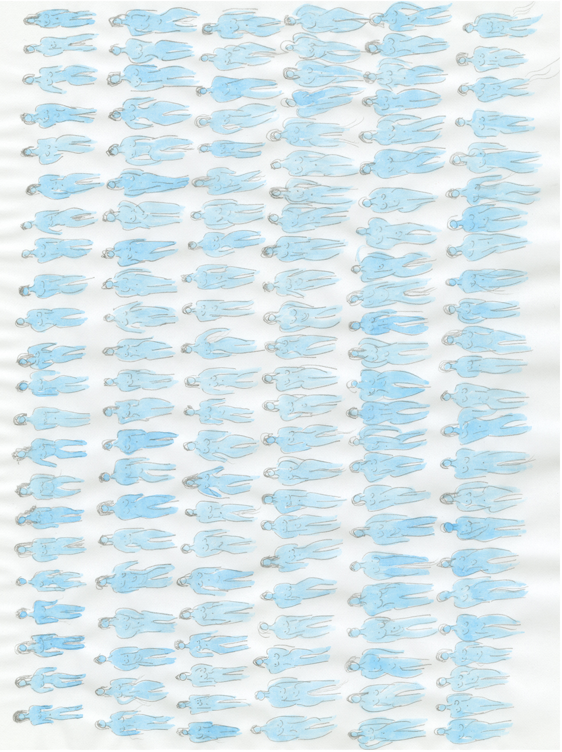 Het midden van de staat, de taille, een grens: is dat open of dicht? Als je het nadert blijven er nieuwe en oude dingen uit tevoorschijn komen, zoals uit de buik van Russische matroesjka’s. Wat popt op uit het midden van de staat? Het midden van de staat, het afval. Is de nieuwe kolonie afval? Zijn de herinneringen afval? De verhalen, de taal? Choi knutselt aan een kolonie van wezen die de oorlog overleven, vastgelegd in hun deels bedachte getuigenissen, gevangenen vol blauwe plekken, vertaald in schematische waterverftekeningen, apparaten uit strafkolonies en neokolonies in een proces van ontmanteling, spiegelwoorden en collages in talloze overlappingen.