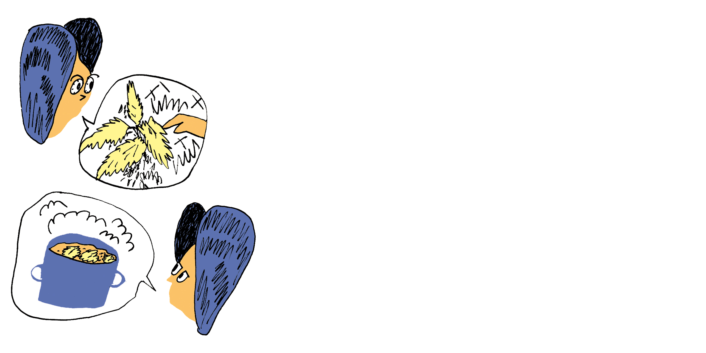Het is er eigenlijk niet het seizoen voor, sterker nog, de afgelopen dagen heeft het zelfs gevroren, maar achter de houtstapel en tussen de nu bijna kale haag staan jonge netels. Ik knip de gekartelde bladeren met de nagels van mijn linker duim en wijsvinger en pluk tijdens het rondje door de tuin ook meteen wat gewone brunel, veldzuring en smalle weegbree. Behalve de brandnetels doe ik al het blad in een pan met 2 liter water dat ik aan de kook breng. Ik voeg wat zeezout toe, dat ik deze lente schepte uit een van de rotspoelen toen het anderhalve maand niet regende en zich langs de dalende waterrand perfecte kristallen afzetten. Met het zout kwam ook wat wier mee dat de bouillon straks een zilte smaak geeft. Voor het contrast schud ik nog een stuk of vijf gedroogde boleten in de pan en dan laat ik de bouillon ten minste twee uur trekken.